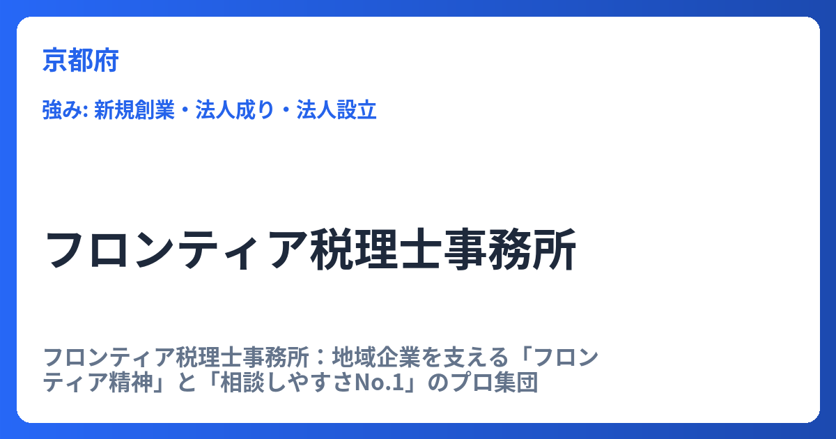 フロンティア税理士事務所:地域企業を支える「フロンティア精神」と「相談しやすさNo.1」のプロ集団 経営環境が目まぐるしく変化する現代において、中小企業が持続的な成長を実現するためには、信頼できる専門家のサポートが不可欠です。特に税務、会計、...