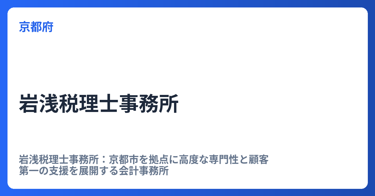 岩浅税理士事務所:京都市を拠点に高度な専門性と顧客第一の支援を展開する会計事務所 岩浅税理士事務所は、京都府京都市下京区に拠点を置く会計事務所です。2008年の設立以来、通常の税務・会計業務の枠を超え、高度な専門知識と豊富な経験に基づいた幅広... -