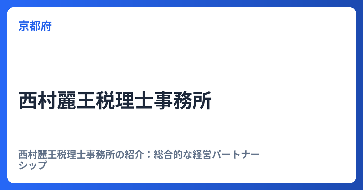西村麗王税理士事務所の紹介:総合的な経営パートナーシップ 西村麗王税理士事務所は、単なる税務処理の代行に留まらず、経営者が直面する多岐にわたる課題に対し、豊富な経験と実績に基づいた包括的なサポートを提供する専門家集団です。事業の成長と安定... -