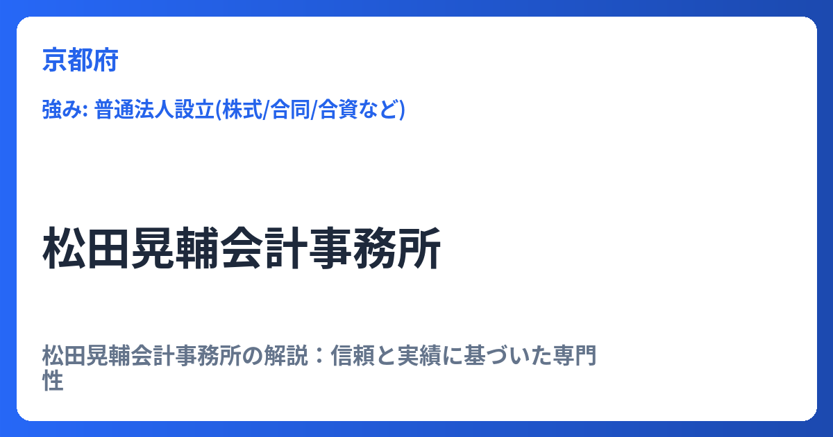 松田晃輔会計事務所の解説:信頼と実績に基づいた専門性 松田晃輔会計事務所は、企業の成長と安定的な経営を強力にサポートする専門性の高い会計事務所です。現代のビジネス環境は急速に変化しており、税務・会計の分野においても、単なる記帳代行や税務申... -