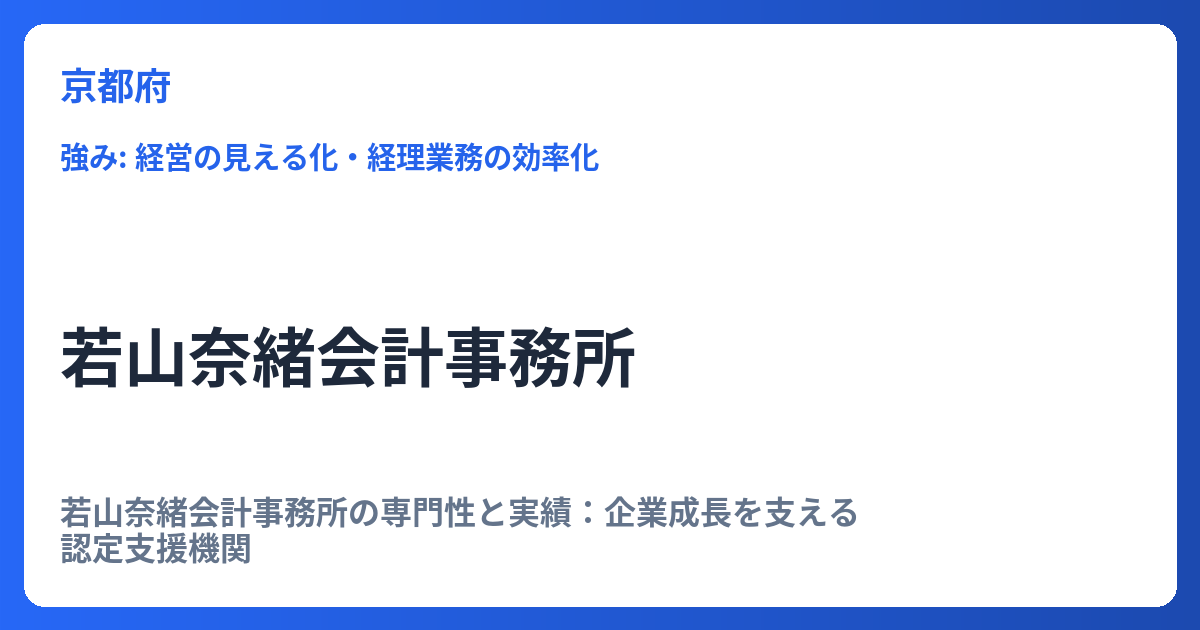 若山奈緒会計事務所の専門性と実績:企業成長を支える認定支援機関 若山奈緒会計事務所は、単なる税務・会計処理の代行に留まらず、企業の持続的な成長と生産性向上を強力にサポートする専門家集団です。そのサービスの信頼性と専門性の高さは、公的な認定... -