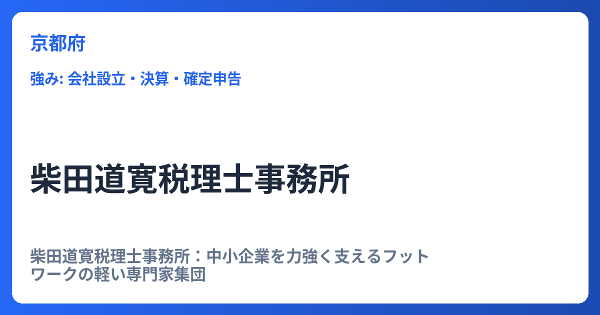 柴田道寛税理士事務所:中小企業を力強く支えるフットワークの軽い専門家集団 柴田道寛税理士事務所は、京都府宇治市六地蔵に拠点を構える税理士事務所です。平成25年4月の開業以来、所長税理士である柴田道寛氏を中心に、地域の中小企業や個人事業主の発... -
