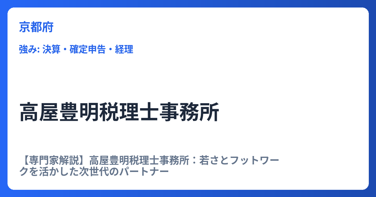 【専門家解説】高屋豊明税理士事務所:若さとフットワークを活かした次世代のパートナー 税理士事務所を選ぶ際、その専門性や経験年数に加え、事務所の「姿勢」や「対応力」は重要な判断基準となります。京都府京都市伏見区に拠点を置く高屋豊明税理士事務... -