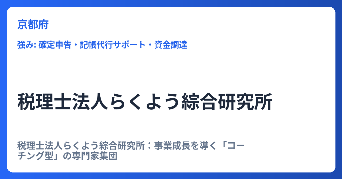 税理士法人らくよう綜合研究所:事業成長を導く「コーチング型」の専門家集団 税理士法人らくよう綜合研究所は、「公認会計士」と「税理士」という二つの国家資格を看板に掲げ、顧客・社会・経済の発展に資することを本懐とする専門家集団です。単なる会計... -