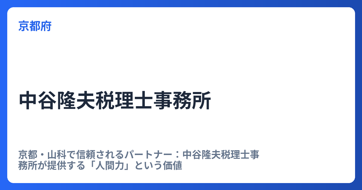 京都・山科で信頼されるパートナー:中谷隆夫税理士事務所が提供する「人間力」という価値 多くの経営者にとって、税理士選びは事業の未来を左右する重要な意思決定です。一般的に、税理士を選ぶ際の基準としては、その事務所の持つ「実績・経験」、日常業... -