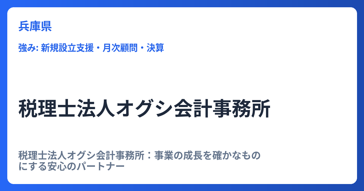 税理士法人オグシ会計事務所:事業の成長を確かなものにする安心のパートナー 税理士法人オグシ会計事務所は、企業の健全な発展を多角的に支援する専門家集団です。単なる税務処理の代行に留まらず、経営者が直面する様々な課題に対して、実効性の高いソリ... -
