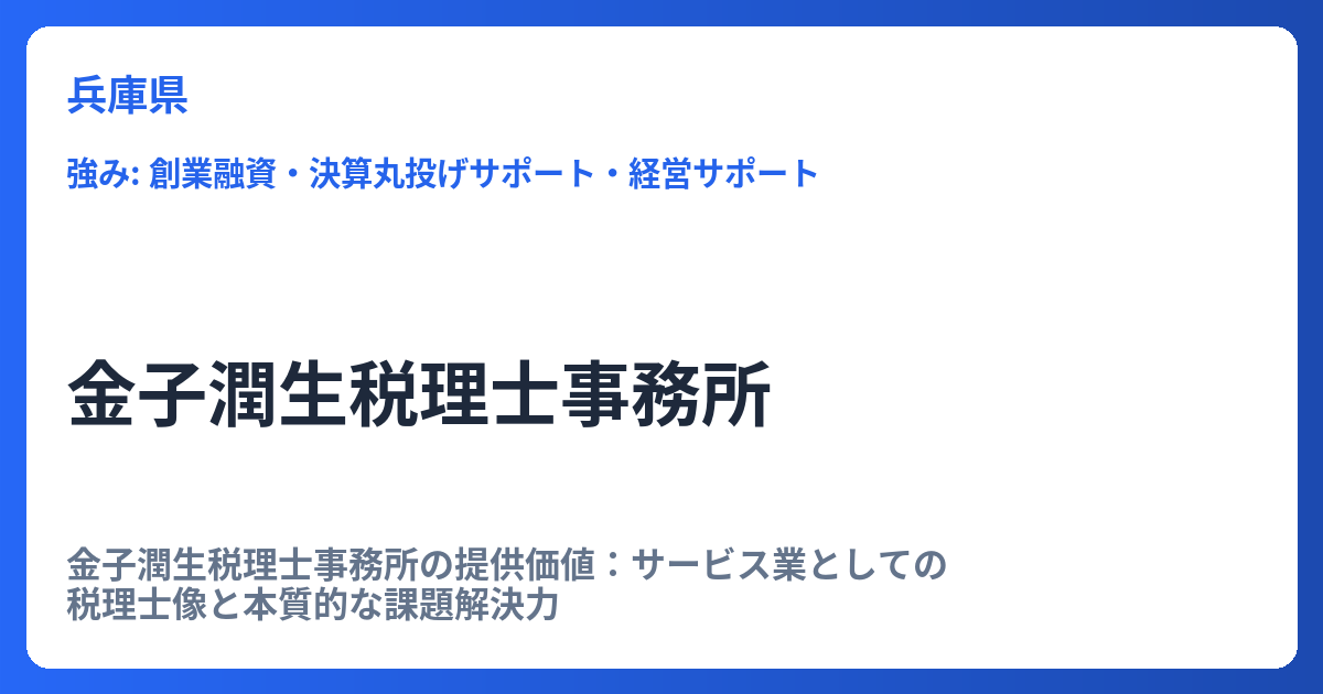 金子潤生税理士事務所の提供価値:サービス業としての税理士像と本質的な課題解決力 税理士業界は、単なる申告業務の代行者という従来の役割から、経営のパートナーへとその役割を変化させています。このような時代の流れの中で、金子潤生税理士事務所は、... -