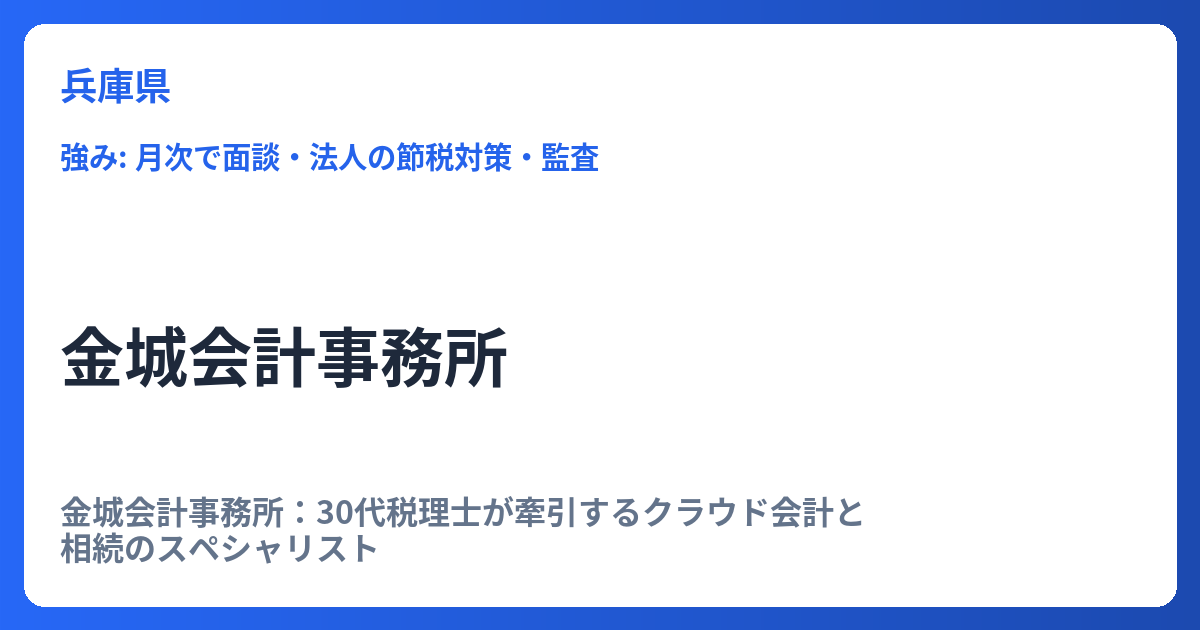 金城会計事務所:30代税理士が牽引するクラウド会計と相続のスペシャリスト 近年、税理士業界はIT技術の進化と事業承継・資産承継ニーズの増加により、大きな変革期を迎えています。このような時代において、特に「クラウド会計」と「相続」という専門分野... -