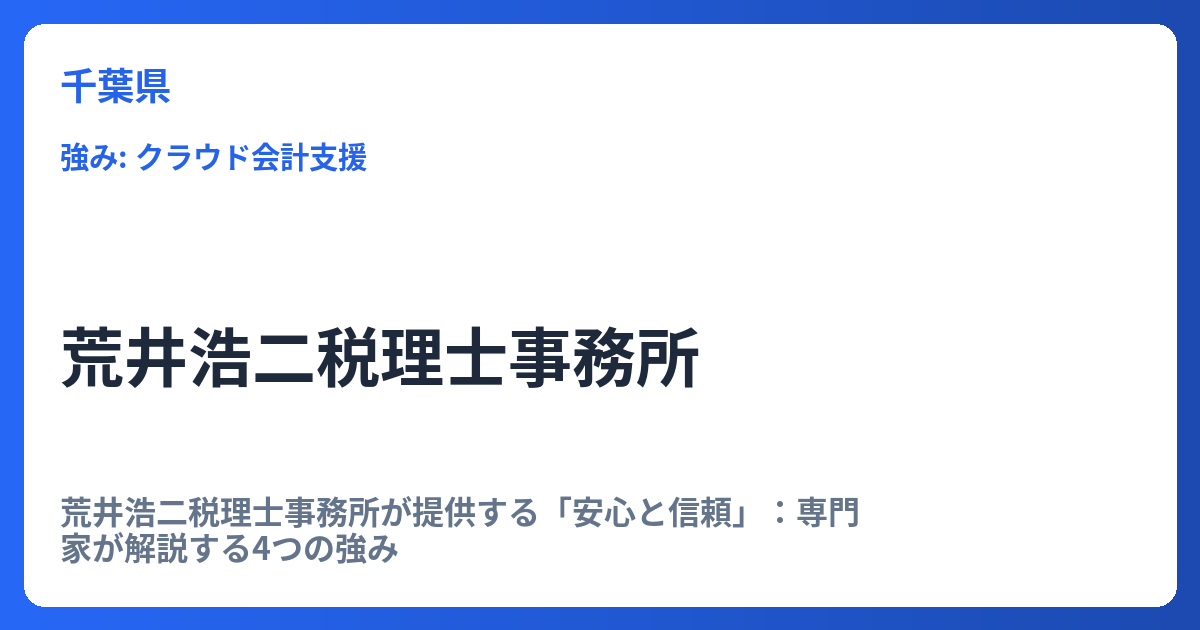 荒井浩二税理士事務所が提供する「安心と信頼」:専門家が解説する4つの強み 税理士選びは、事業経営や個人の資産形成において極めて重要な意思決定です。数多くの税理士事務所が存在する中で、どのような基準でパートナーを選定すべきか、その判断は難し... -