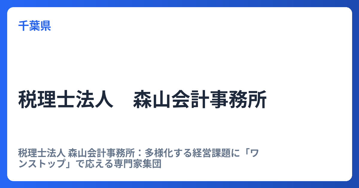 税理士法人 森山会計事務所:多様化する経営課題に「ワンストップ」で応える専門家集団 現代の企業経営において、税務や会計はもちろんのこと、法的な手続きや経営戦略の策定など、専門的な知見を必要とする業務は多岐にわたります。税理士法人 森山会計事... -