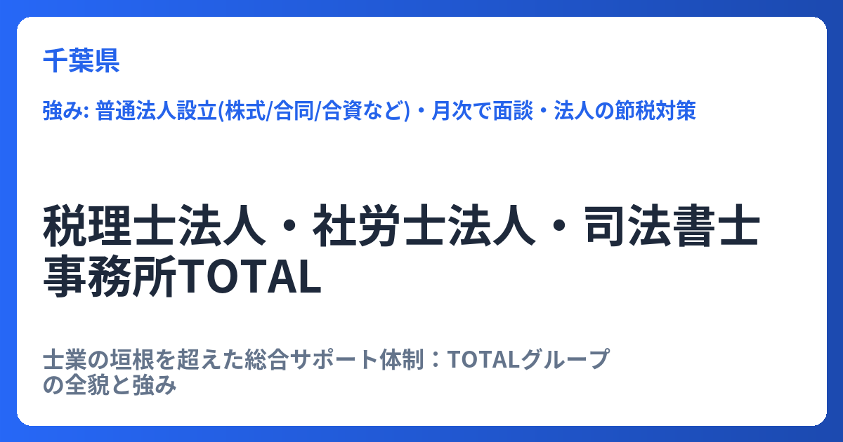 士業の垣根を超えた総合サポート体制:TOTALグループの全貌と強み 現代のビジネス環境は複雑化しており、企業経営においては税務、労務、法務、そしてデジタル戦略に至るまで、多岐にわたる専門知識が不可欠となっています。このような時代背景において、... -