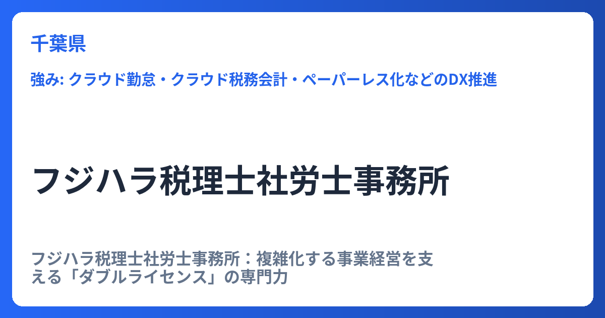 フジハラ税理士社労士事務所:複雑化する事業経営を支える「ダブルライセンス」の専門力 現代の事業経営において、税務と労務は避けて通れない重要な要素ですが、その制度は年々複雑さを増しています。特に中小企業の経営者や個人事業主にとって、これらの... -