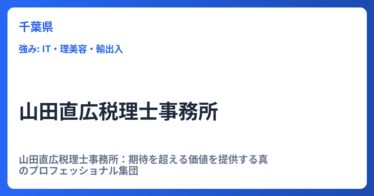 山田直広税理士事務所:期待を超える価値を提供する真のプロフェッショナル集団 山田直広税理士事務所は、単なる税務処理の代行に留まらず、クライアントの経営を最前線で支えるパートナーとして、高い評価を得ています。変化の激しい現代において、企業経... -