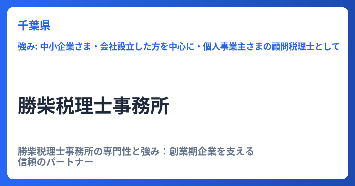 勝柴税理士事務所の専門性と強み:創業期企業を支える信頼のパートナー 事業の立ち上げ期は、経営者にとって最も多忙を極める時期です。日々の営業活動や製品開発、組織づくりに奔走する中で、どうしても経営数値の細かなチェックや、煩雑な経理・税務処理... -