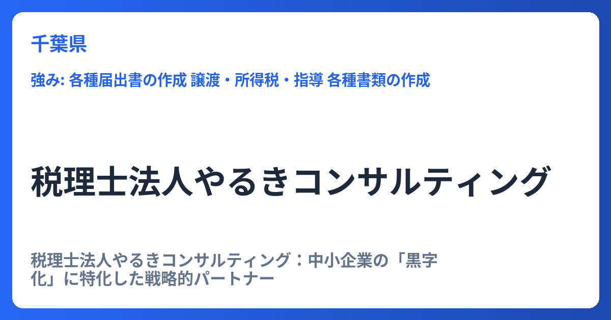 税理士法人やるきコンサルティング:中小企業の「黒字化」に特化した戦略的パートナー 千葉県市川市に拠点を置く税理士法人やるきコンサルティングは、単なる税務・会計の代行にとどまらず、中小企業の持続的な成長、特に「黒字化の実現」に全力を注ぐ、地... -