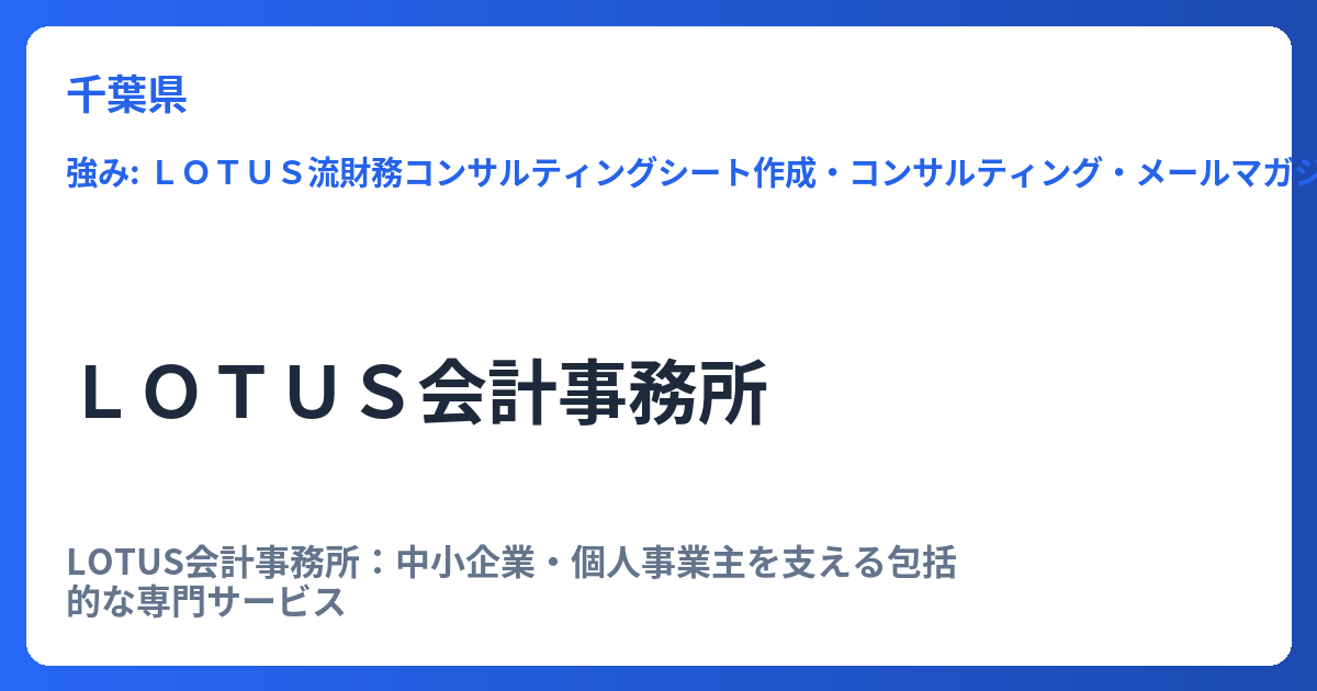 LOTUS会計事務所:中小企業・個人事業主を支える包括的な専門サービス LOTUS会計事務所は、中小企業や個人事業主の方々を主な対象とし、税務顧問を核とした多岐にわたる専門サービスを提供しています。単なる税務処理に留まらず、企業の成長と事業承継、そ... -