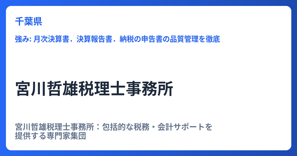 宮川哲雄税理士事務所:包括的な税務・会計サポートを提供する専門家集団 宮川哲雄税理士事務所は、企業経営から個人の資産管理に至るまで、多岐にわたる税務・会計の課題に対し、専門的な知識と経験に基づく包括的なサポートを提供しています。変化の激し... -