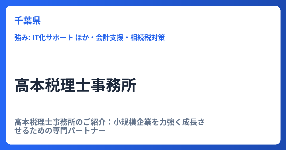高本税理士事務所のご紹介:小規模企業を力強く成長させるための専門パートナー 高本税理士事務所は、「小さな会社を大きく育てるお手伝い」を理念に掲げ、顧問先企業の持続的な成長と経営基盤の強化を支援する専門家集団です。単なる税務申告代行に留まら... -