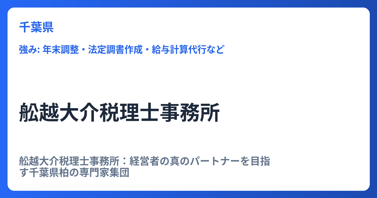 舩越大介税理士事務所:経営者の真のパートナーを目指す千葉県柏の専門家集団 千葉県柏市に拠点を置く舩越大介税理士事務所は、単なる記帳代行や税務申告を担う存在ではなく、経営者にとって最も信頼できる「経営の相談相手」であるという明確な理念を掲げ... -