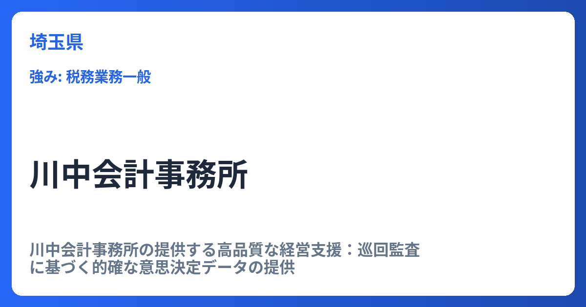 川中会計事務所の提供する高品質な経営支援:巡回監査に基づく的確な意思決定データの提供 経営環境が目まぐるしく変化する現代において、企業が持続的に成長するためには、自社の現状を正確に把握し、迅速かつ的確な意思決定を下すことが不可欠です。川中...