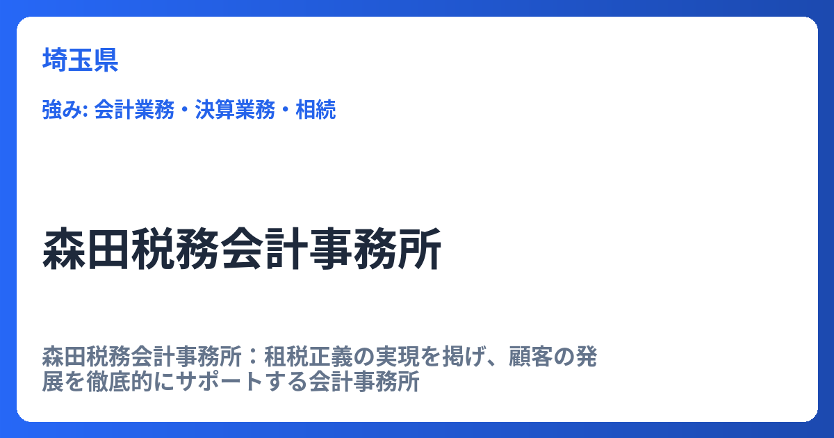 森田税務会計事務所:租税正義の実現を掲げ、顧客の発展を徹底的にサポートする会計事務所 森田税務会計事務所は、単なる記帳代行や税務申告の代行業務に留まらず、「租税正義の実現」という高い理念を念頭に置き、顧客企業の持続的な発展を支える専門家集... -
