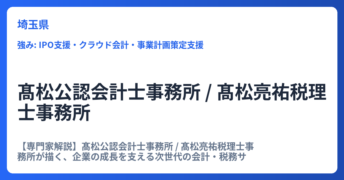 【専門家解説】髙松公認会計士事務所 / 髙松亮祐税理士事務所が描く、企業の成長を支える次世代の会計・税務サポート 髙松公認会計士事務所 / 髙松亮祐税理士事務所は、2021年10月に開業した比較的新しい事務所でありながら、その提供するサービスの質と幅... -