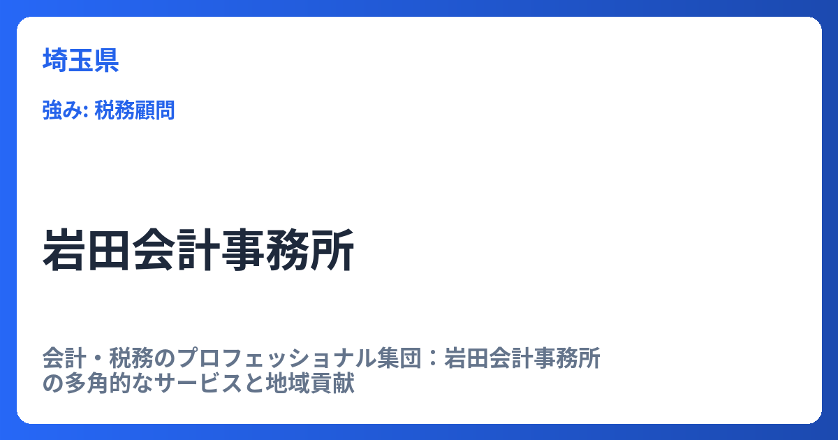 会計・税務のプロフェッショナル集団:岩田会計事務所の多角的なサービスと地域貢献 「岩田会計事務所」は、日本各地に拠点を持ち、地域社会や企業の成長を力強く支える会計・税務の専門家集団です。単なる税務申告の代行業者に留まらず、企業の未来を共に... -