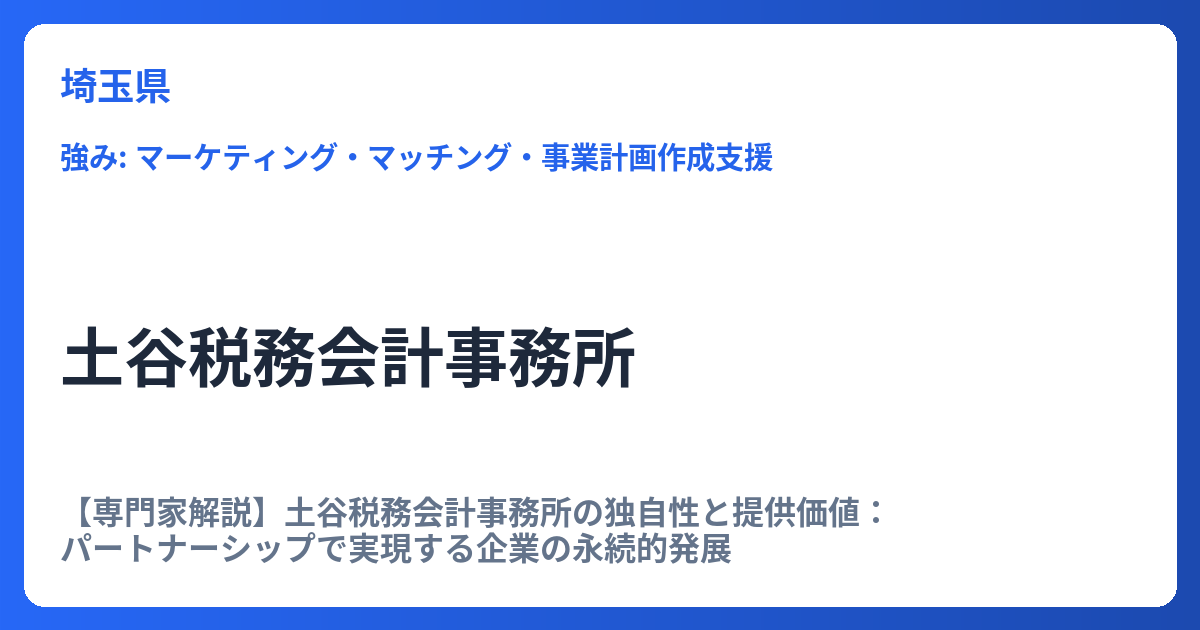 【専門家解説】土谷税務会計事務所の独自性と提供価値:パートナーシップで実現する企業の永続的発展 激しい市場競争の中で企業が安定的に成長し、永続的な発展を目指すためには、単なる税務申告に留まらない、戦略的な経営サポートが不可欠です。埼玉県と... -