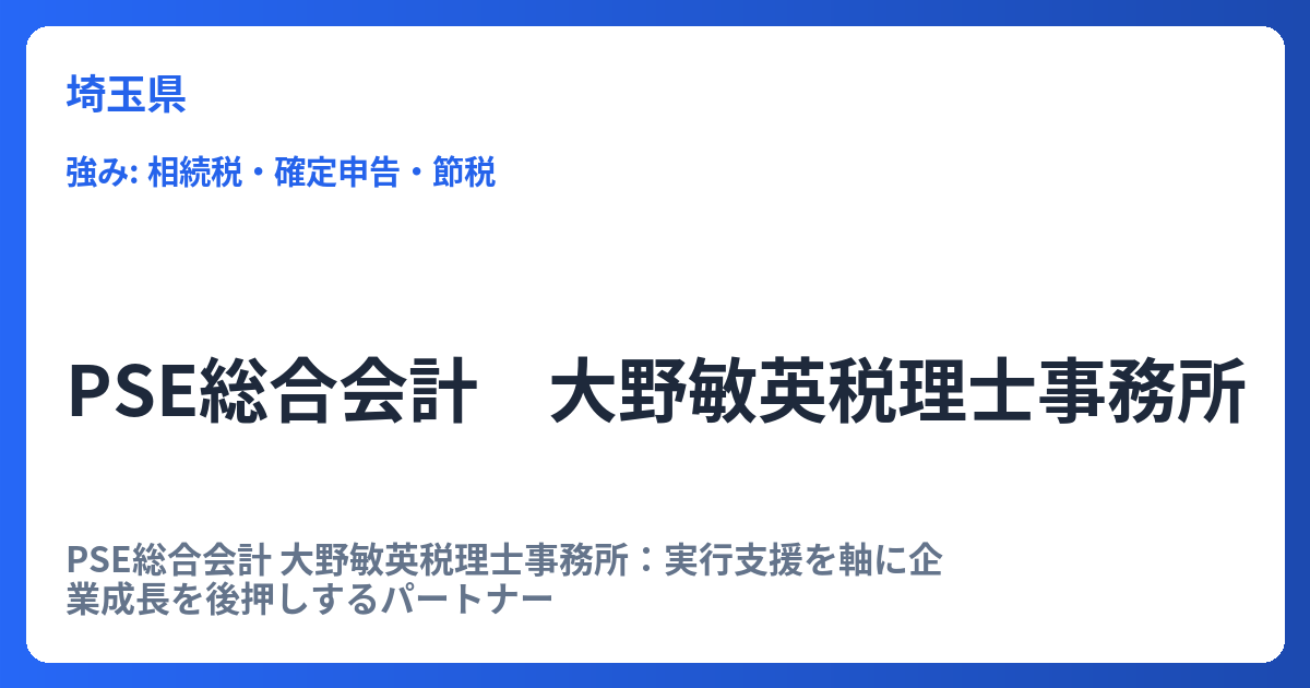 PSE総合会計 大野敏英税理士事務所:実行支援を軸に企業成長を後押しするパートナー 多くの中小企業にとって、経理・財務は事業の基盤を支える重要な要素でありながら、専門的な知識やリソース不足から課題を抱えやすい領域です。その中で、PSE総合会計 大... -