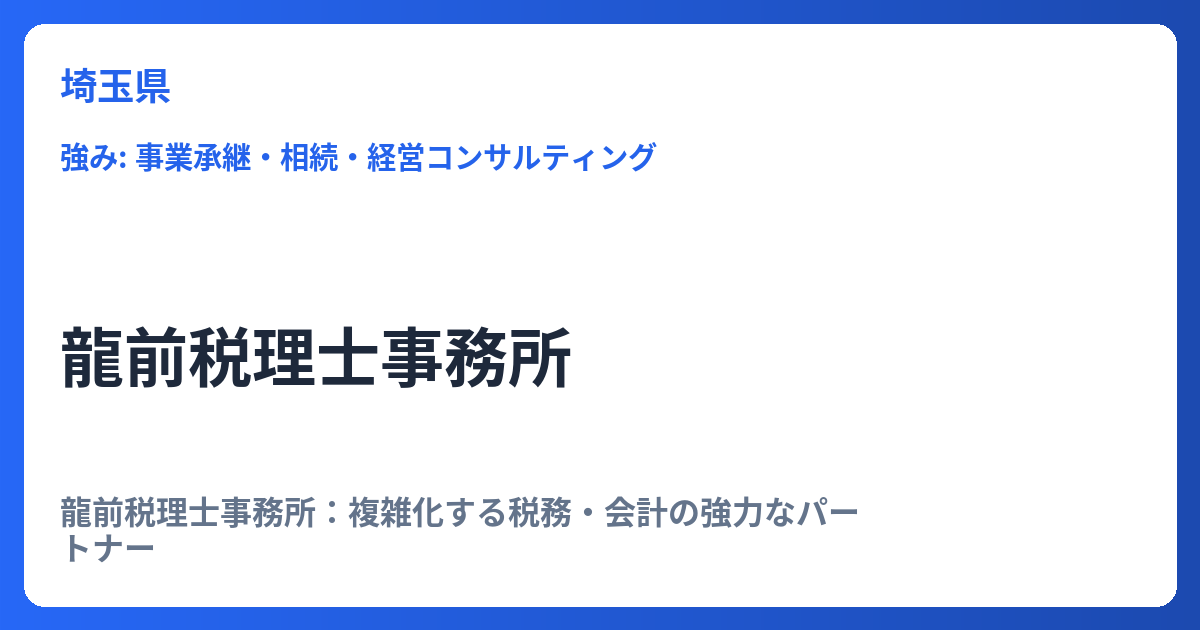 龍前税理士事務所:複雑化する税務・会計の強力なパートナー 現代のビジネス環境において、企業経営者や個人事業主は、経済のグローバル化や頻繁な税制改正に対応し続ける必要があります。特に日本国内においては、税務・会計に関する知識が企業の存続と成... -