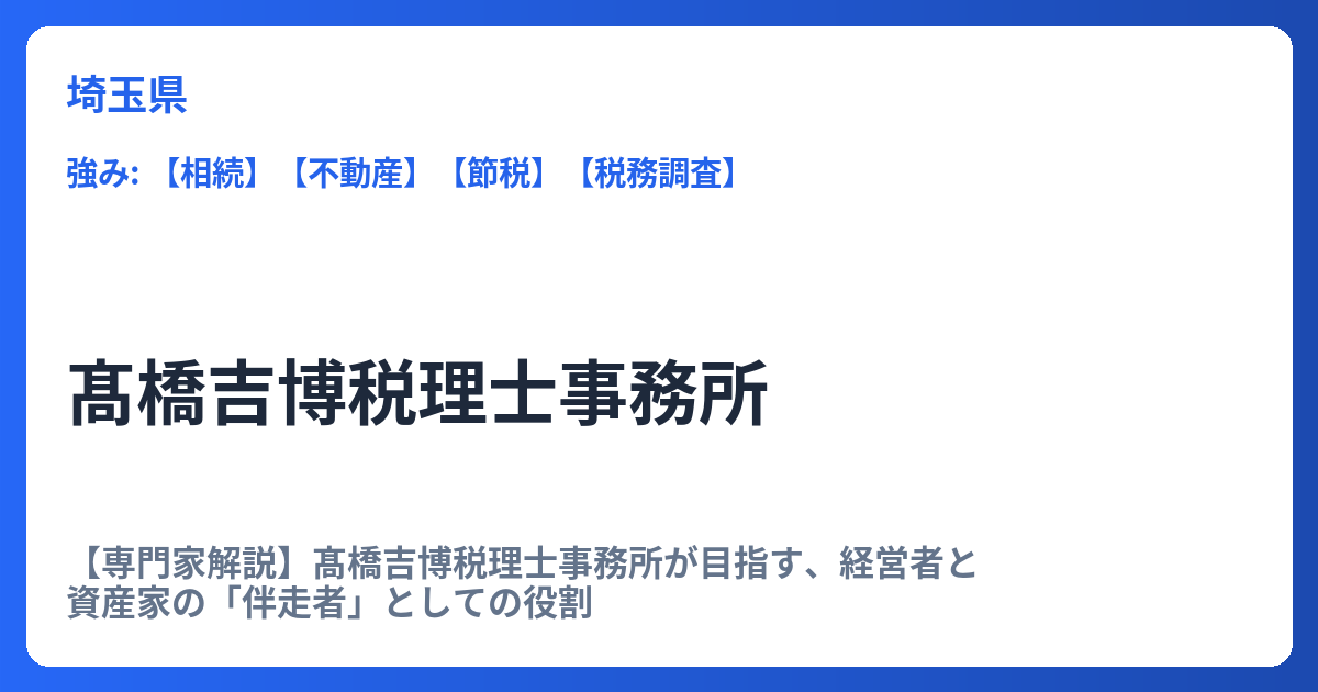 【専門家解説】髙橋吉博税理士事務所が目指す、経営者と資産家の「伴走者」としての役割 髙橋吉博税理士事務所は、単なる過去の会計処理代行者としてではなく、「お客様の未来を共創する外部ブレーン」として独自の価値を提供しています。資産家や企業経営... -