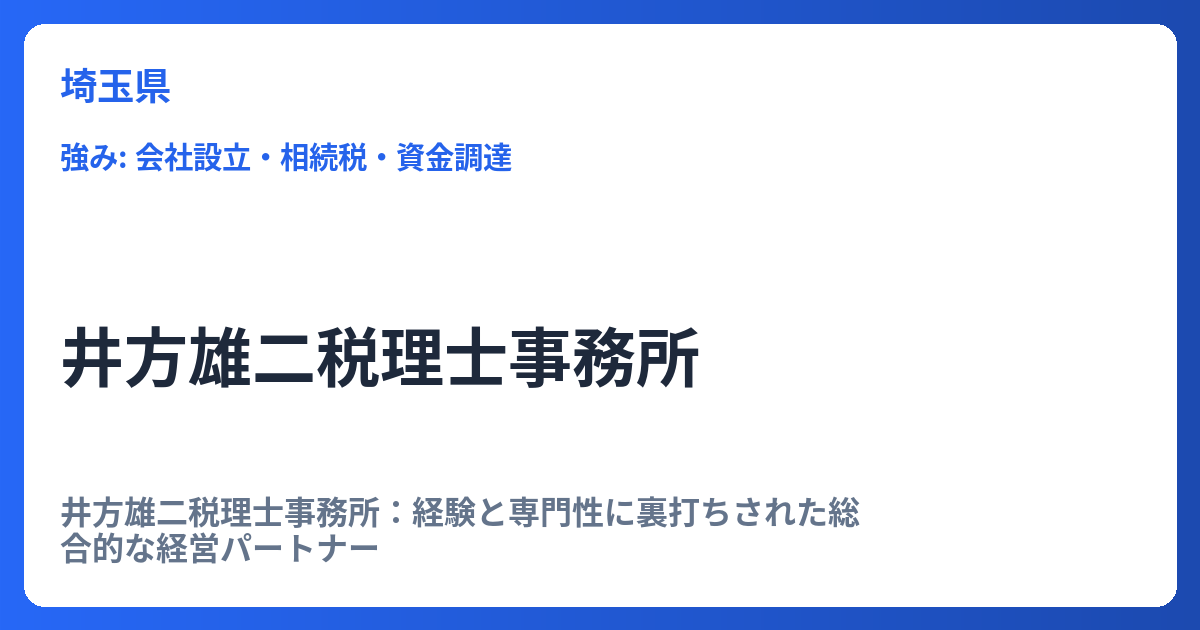 井方雄二税理士事務所:経験と専門性に裏打ちされた総合的な経営パートナー 井方雄二税理士事務所は、単なる税務申告代行に留まらず、企業の成長ステージに応じた多角的かつ専門的なサポートを提供している事務所です。特に、豊富な経験に裏打ちされた最適... -