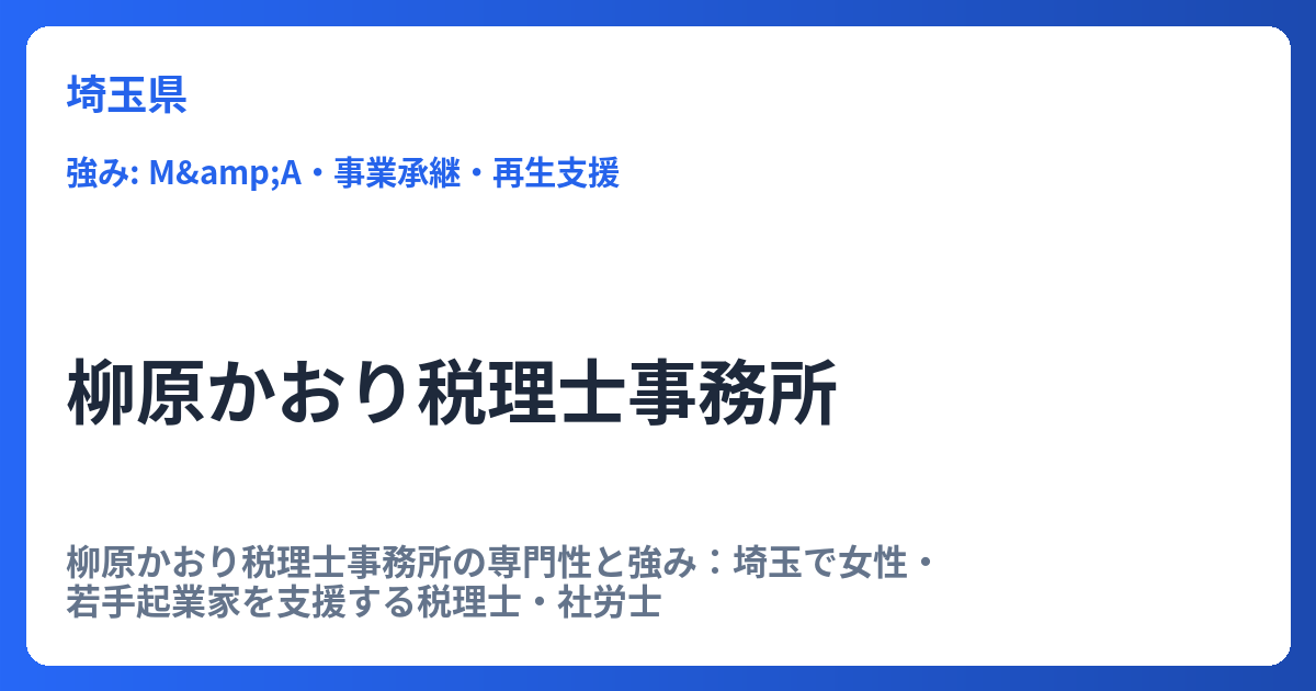 柳原かおり税理士事務所の専門性と強み:埼玉で女性・若手起業家を支援する税理士・社労士 経済環境が複雑化する現代において、特にスタートアップや中小企業、そして個人事業主にとって、信頼できる税務・労務の専門家の存在は事業成功の鍵となります。埼... -