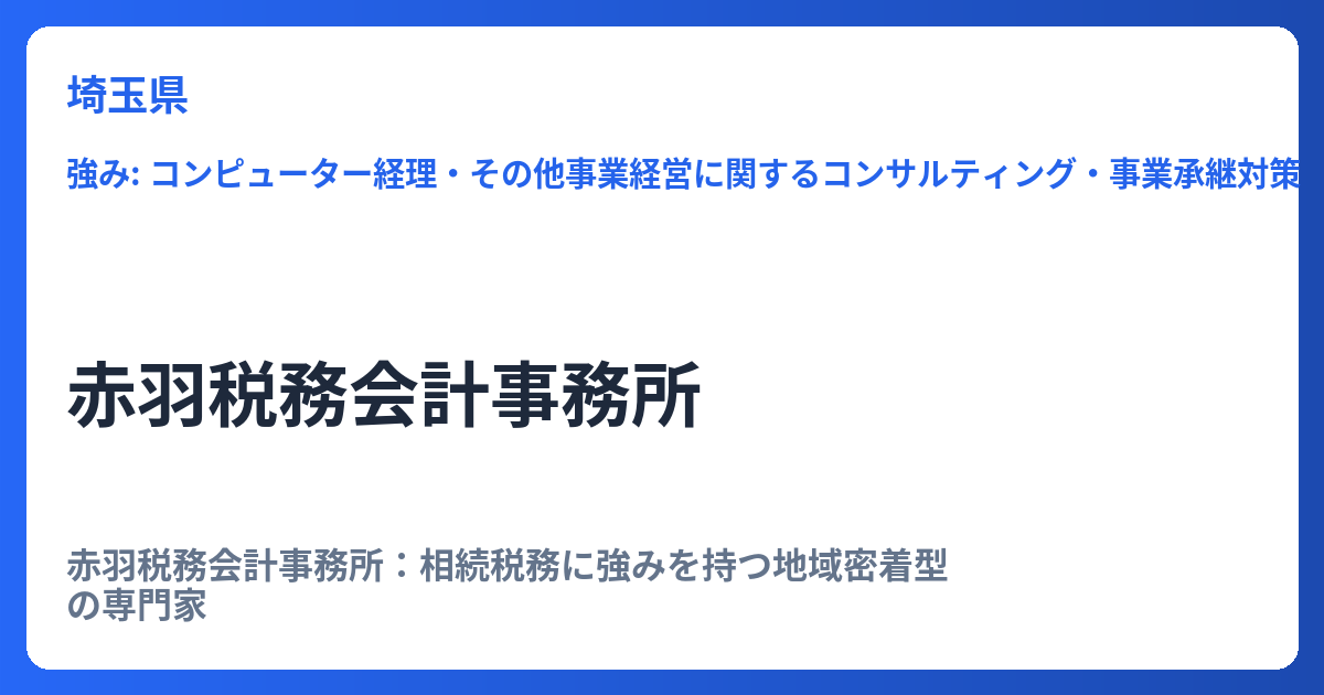 赤羽税務会計事務所:相続税務に強みを持つ地域密着型の専門家 相続税の申告や事業に関する税務は、専門的な知識が不可欠であり、依頼する事務所の実績と信頼性が極めて重要になります。東京都北区に位置する赤羽税務会計事務所は、長年にわたり地域に根ざ... -