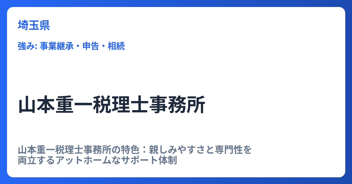 山本重一税理士事務所の特色:親しみやすさと専門性を両立するアットホームなサポート体制 税理士事務所と聞くと、格式高く、やや敷居が高いイメージを持つ方も少なくないかもしれません。しかし、山本重一税理士事務所は、そうした固定観念を覆す、非常に... -