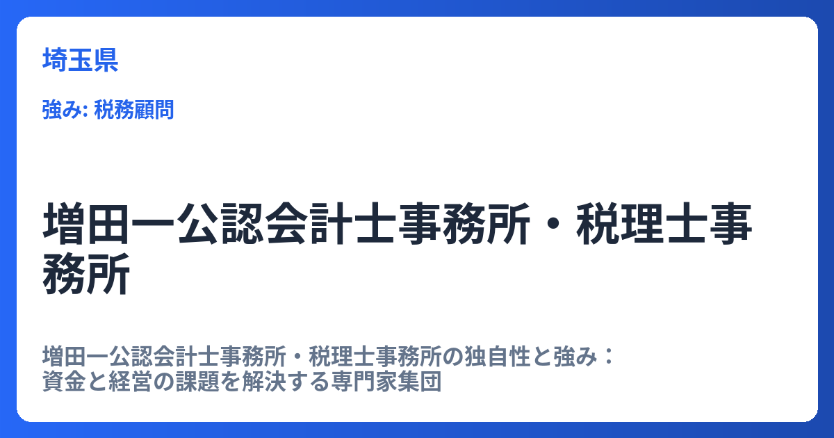 増田一公認会計士事務所・税理士事務所の独自性と強み:資金と経営の課題を解決する専門家集団 公認会計士事務所および税理士事務所は、企業にとって欠かせない会計・税務のプロフェッショナルですが、増田一公認会計士事務所・税理士事務所は、その一般的... -