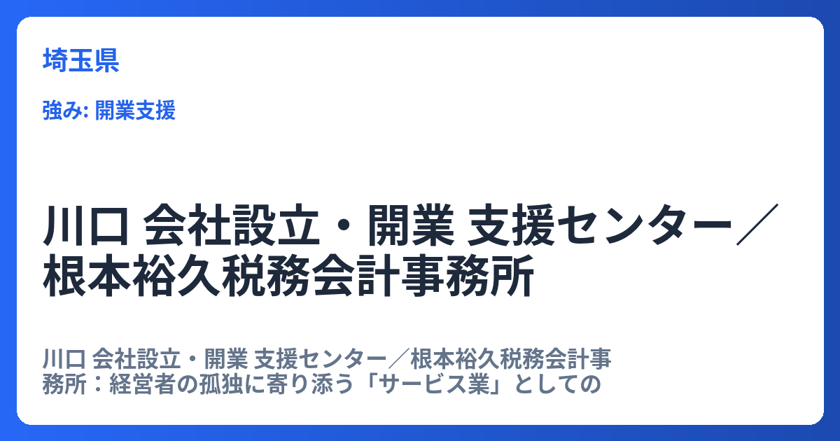 川口 会社設立・開業 支援センター/根本裕久税務会計事務所:経営者の孤独に寄り添う「サービス業」としての税務会計 中小企業経営者が直面する課題は、税務・会計の範疇に留まらず、多岐にわたります。特に創業期や事業の転換期においては、その問題解決... -