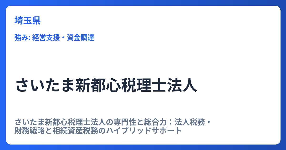 さいたま新都心税理士法人の専門性と総合力:法人税務・財務戦略と相続資産税務のハイブリッドサポート 現代の企業経営者や資産家が直面する課題は複雑化の一途を辿っています。特に税務・財務領域においては、法人事業の持続的な成長戦略と、それに密接に... -
