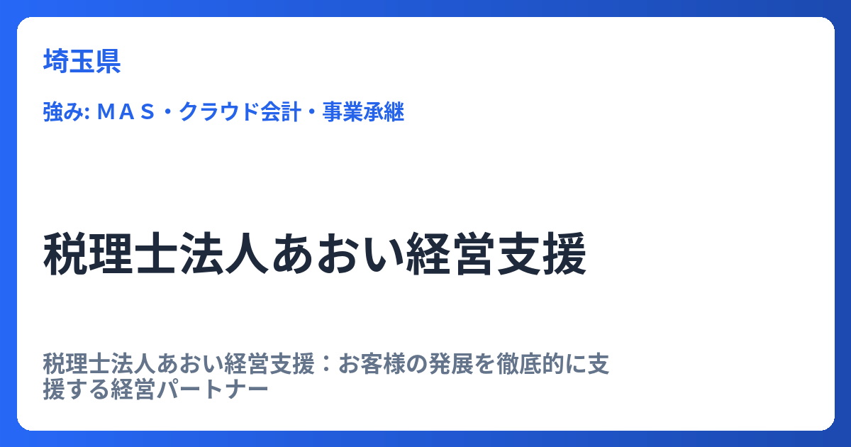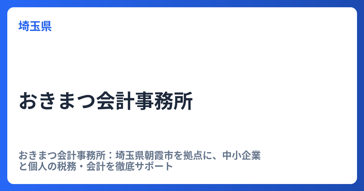 おきまつ会計事務所:埼玉県朝霞市を拠点に、中小企業と個人の税務・会計を徹底サポート 埼玉県朝霞市に拠点を構えるおきまつ会計事務所は、地域に根差した専門家として、幅広い税務・会計ニーズに対応しています。特に、相続税申告や所得税申告といった個... -