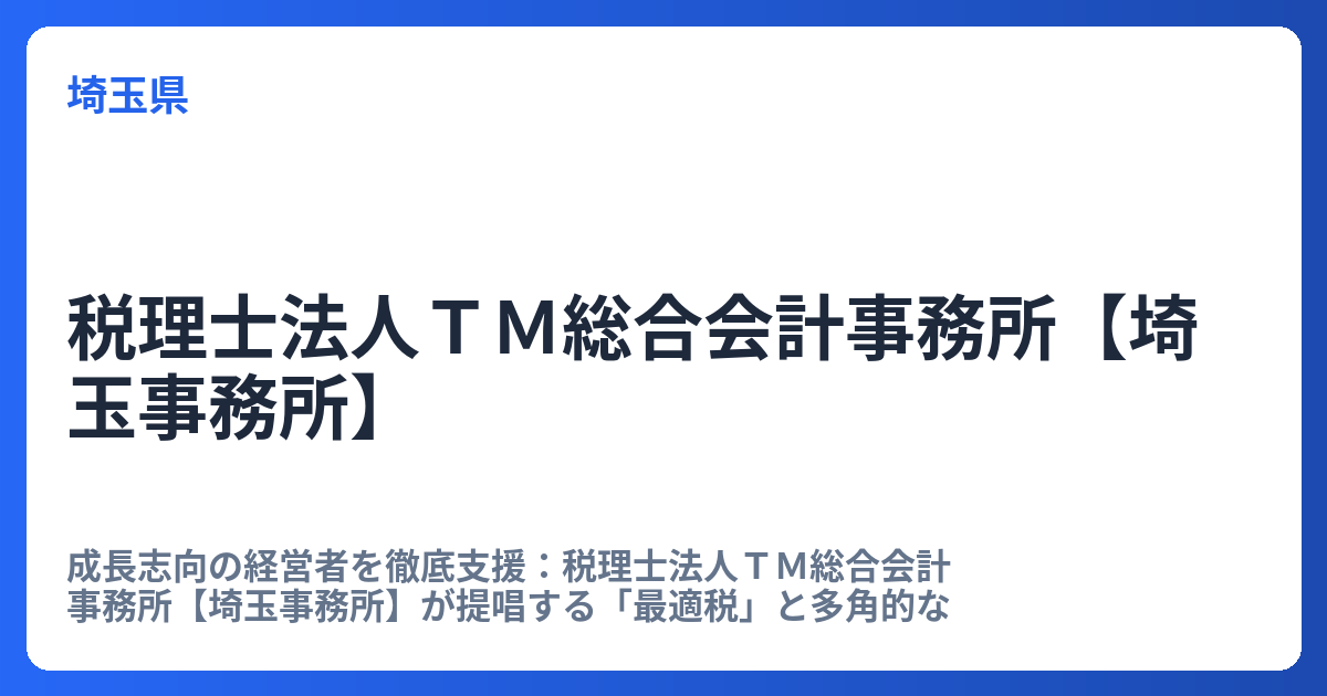 成長志向の経営者を徹底支援:税理士法人TM総合会計事務所【埼玉事務所】が提唱する「最適税」と多角的なコンサルティング 多くの経営者にとって、会計事務所の役割は「税金対策」に尽きると思われがちです。しかし、税理士法人TM総合会計事務所【埼玉... -