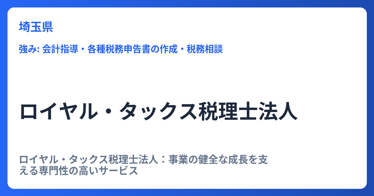 ロイヤル・タックス税理士法人:事業の健全な成長を支える専門性の高いサービス ロイヤル・タックス税理士法人は、企業の安定的な経営と発展を多角的にサポートする専門家集団です。税務・会計の領域にとどまらず、事業主様が直面する様々な課題に対応でき... -