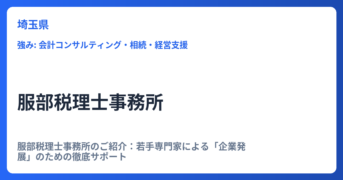 服部税理士事務所のご紹介:若手専門家による「企業発展」のための徹底サポート 服部税理士事務所は、企業の成長と発展を力強くサポートすることに特化した専門家集団です。特に、機動性と柔軟性を兼ね備えた30代の若手税理士2名が中心となり、従来の税理... -