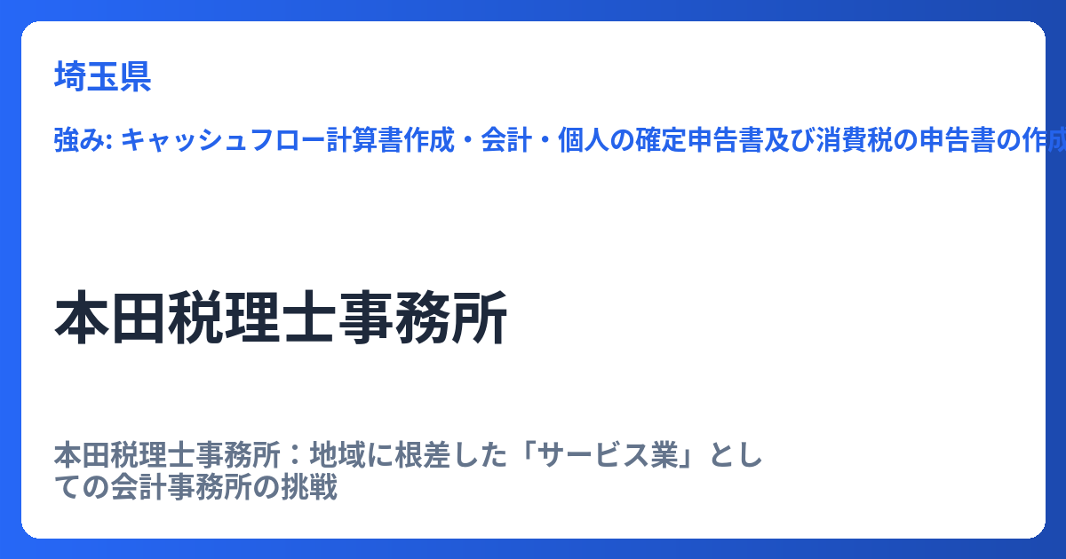 本田税理士事務所:地域に根差した「サービス業」としての会計事務所の挑戦 本田税理士事務所は、従来の「税理士業」の枠を超え、「サービス業」としての顧客志向を徹底する、先進的な会計事務所です。埼玉県蕨市において約半世紀、3代にわたり地域経済の... -