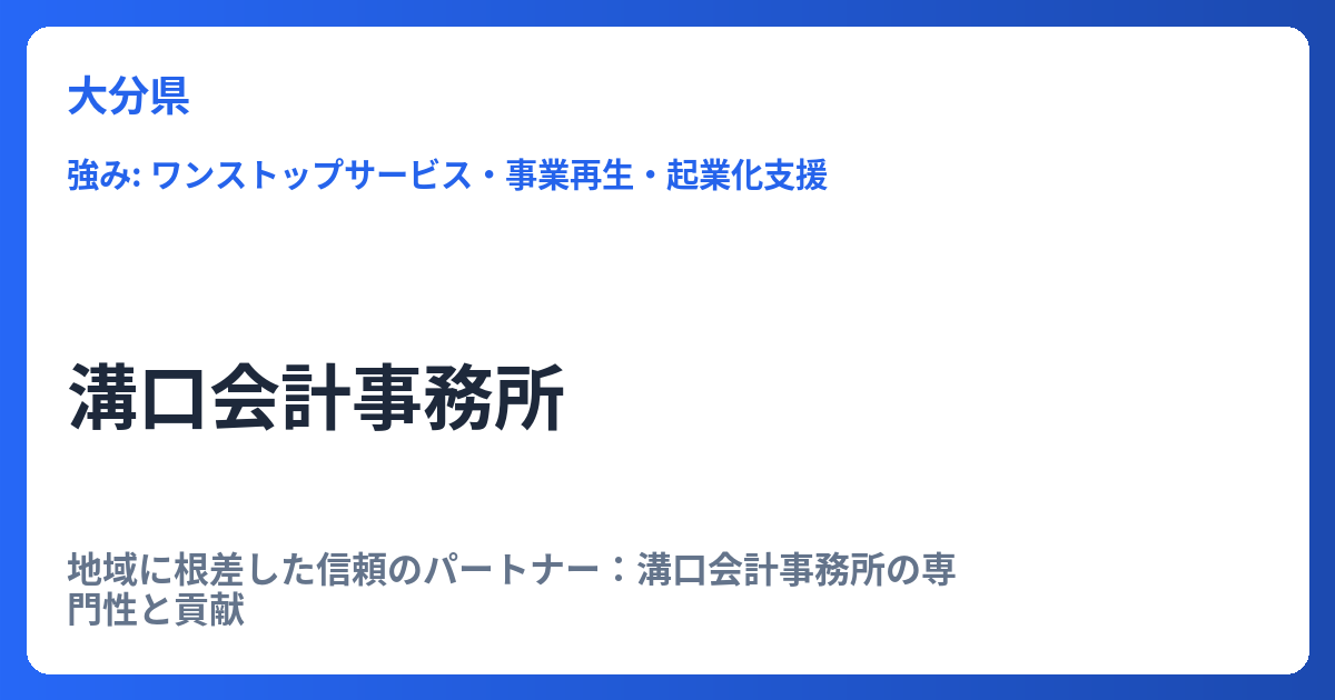 地域に根差した信頼のパートナー:溝口会計事務所の専門性と貢献 大分県湯布院を拠点とする溝口会計事務所は、地域のお客様からの信頼を最優先に考え、会計・税務の専門サービスを提供しています。特に「お気軽になんでもご相談いただける税理士事務所」で...