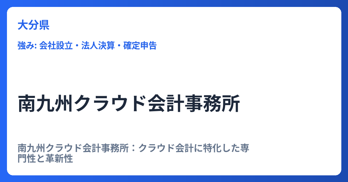 南九州クラウド会計事務所:クラウド会計に特化した専門性と革新性 近年、企業のバックオフィス業務の効率化は、競争力を高める上で不可欠な要素となっています。特に経理・財務分野では、クラウド会計システムの導入が急速に進んでおり、その専門的なサポ... -