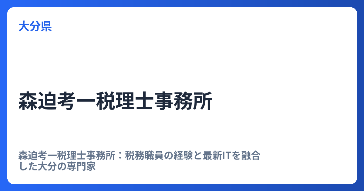森迫考一税理士事務所:税務職員の経験と最新ITを融合した大分の専門家 大分県を拠点とする森迫考一税理士事務所は、単なる税務代行に留まらない、現代の経営課題に対応した多角的なサポートを提供しています。特に、長年の税務職員としてのキャリアと税理... -