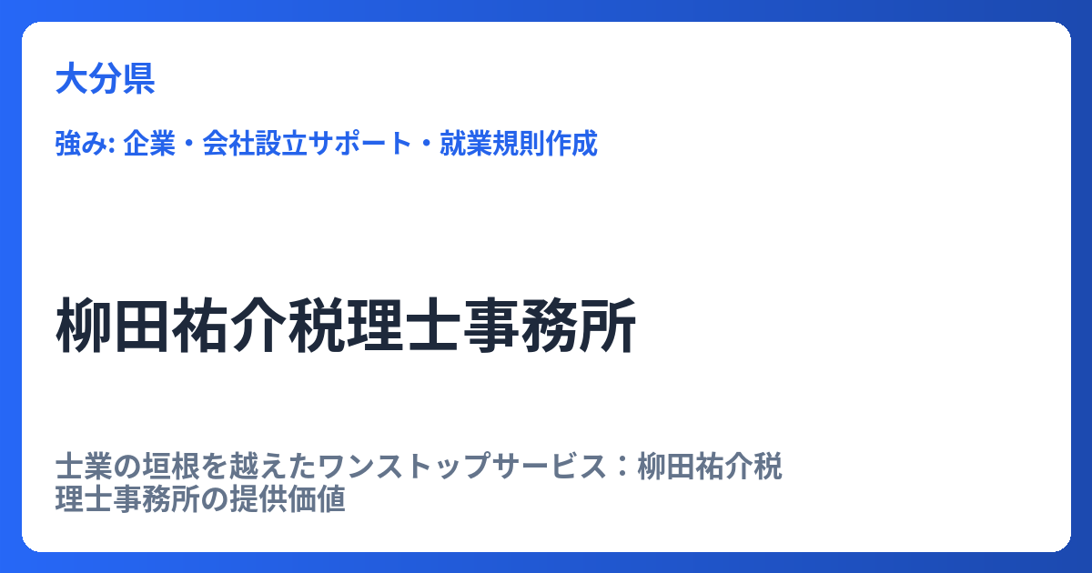 士業の垣根を越えたワンストップサービス:柳田祐介税理士事務所の提供価値 企業経営を取り巻く課題は多岐にわたり、税務、労務、法務といった専門分野が複雑に絡み合っています。従来、これらの課題に対応するためには、税理士、社会保険労務士、行政書士... -