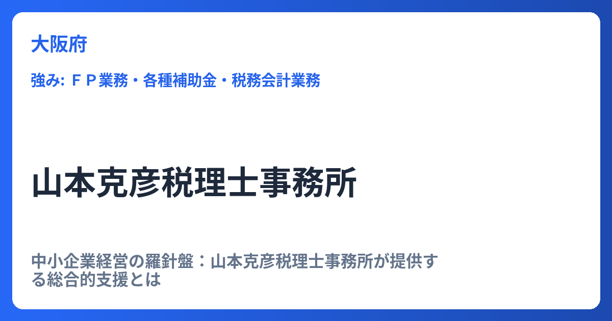 中小企業経営の羅針盤:山本克彦税理士事務所が提供する総合的支援とは 中小企業が直面する経営課題は多岐にわたり、税務・会計の枠を超えた総合的なサポートが求められています。山本克彦税理士事務所は、まさにそうした現代の経営ニーズに応える「中小企... -