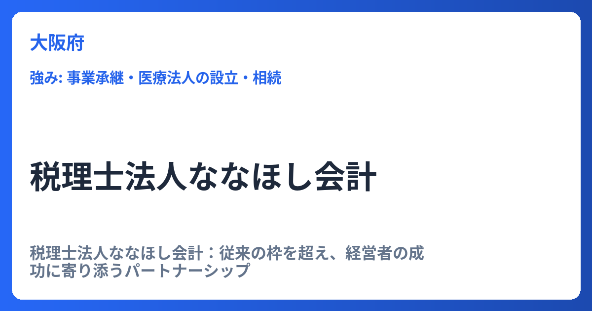 税理士法人ななほし会計:従来の枠を超え、経営者の成功に寄り添うパートナーシップ 税理士法人ななほし会計は、従来の会計事務所の役割を再定義し、時代の変化に対応した新しい価値提供を目指している専門家集団です。単なる「作業代行者」としてではなく... -