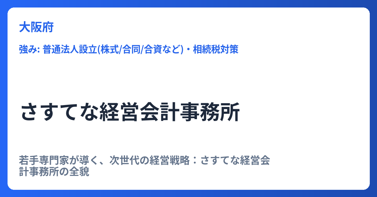 若手専門家が導く、次世代の経営戦略:さすてな経営会計事務所の全貌 ビジネスの環境が目まぐるしく変化する現代において、企業が持続的に成長するためには、従来の枠にとらわれない柔軟で戦略的な会計・税務サポートが不可欠です。「さすてな経営会計事務... -